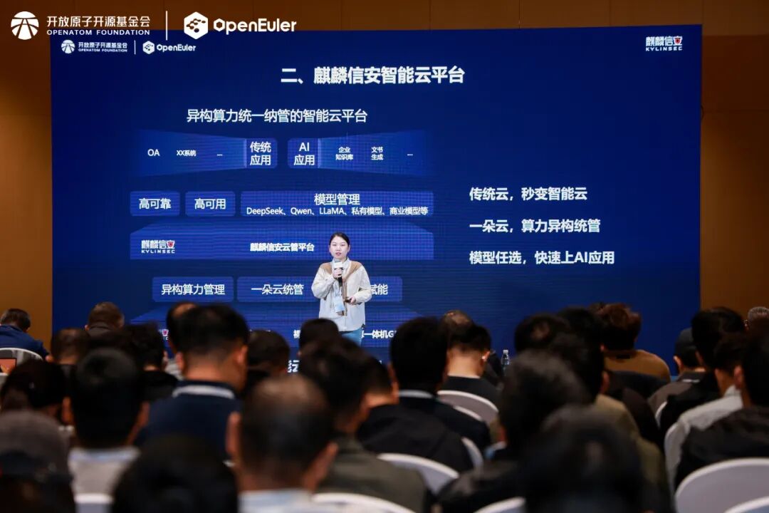 智能云系列产品隆重揭晓,是本次分论坛的另一大亮点。新一代麒麟信安智能云,全栈基于麒麟信安操作系统底座,构建四大AI赋能产品矩阵,形成从基础设施到应用场景的完整闭环,为千行百业提供智能、安全、可靠的云服务基础设施:智算一体机实现开箱即用的AI算力软硬件一体化交付;智能云平台通过一朵云提供统一纳管异构算力;智能云桌面集成从管理到桌面使用的全场景覆盖AI能力;智能运维系统支持AI异常巡检、根因分析,实现从被动响应向主动预警、精准决策升级。