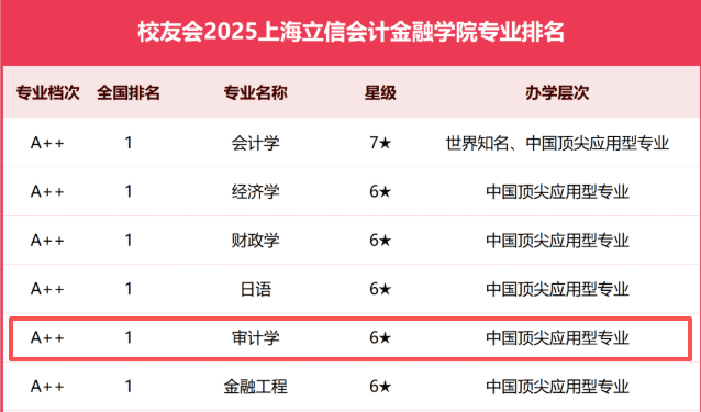 这所学校的应用型首先体现在专业设置上,一般而言,应用型专业不仅注重实践教学环节,其育人模式还通常围绕职业能力构建,以培养技术技能型或复合创新型人才为目标。而立信的审计学专业称得上是应用型专业的绝佳典范,这一特质不仅是专业的核心标签,更得到了权威排名的印证——在校友会2025审计学专业排名中,该校审计学专业获评六星级应用型专业(6★,A++),稳居全国应用型高校同类专业榜首。