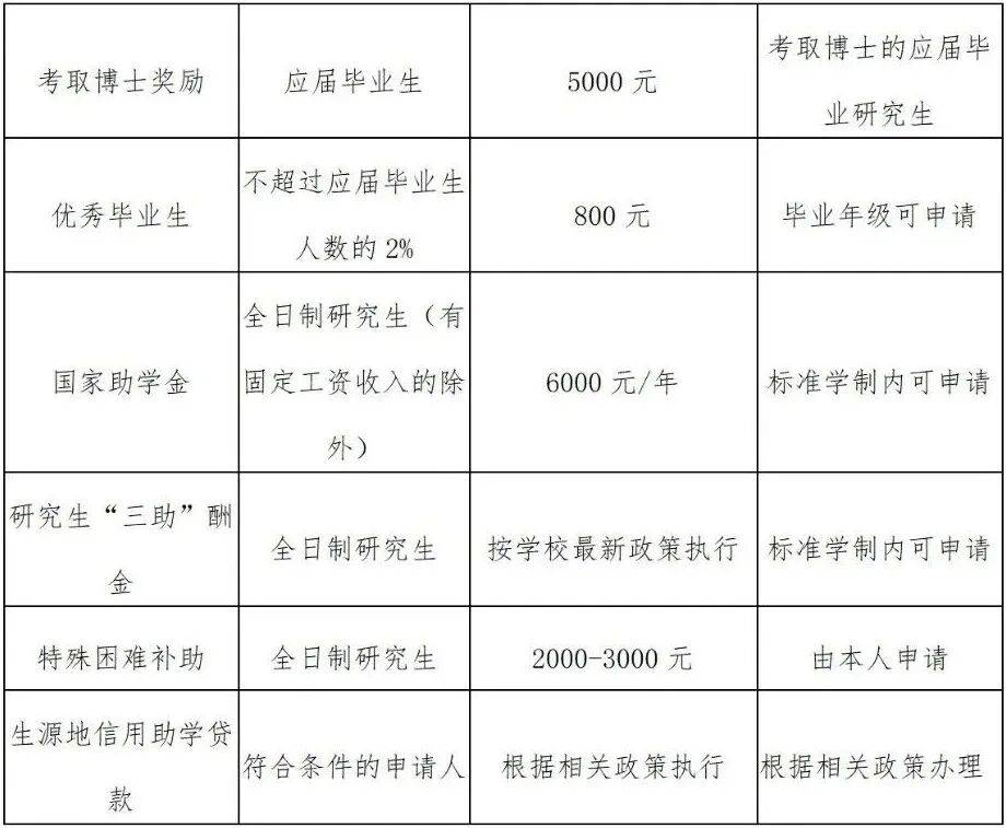 为完善研究生教育保障和激励机制,调动研究生参与科学研究和创新实践积极性,学校设立多种奖助学金。奖助体系见下表。