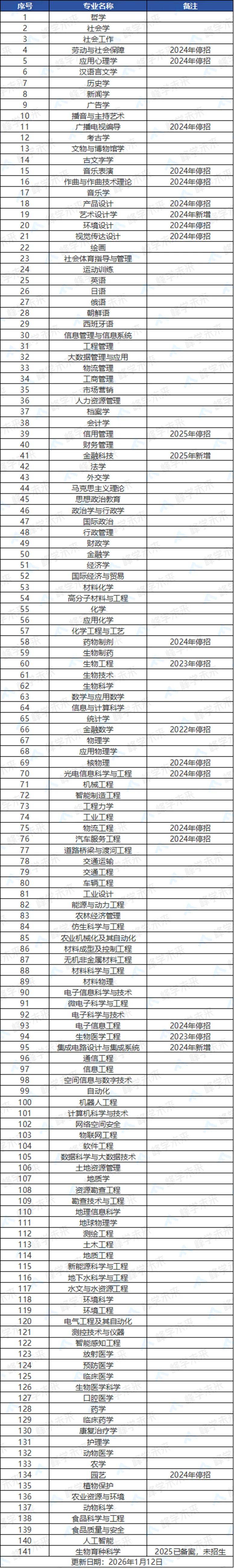 19个停招专业中,信用管理为2025年停招,劳动与社会保障、应用心理学、药物制剂、生物工程、金融数学、核物理、光电信息科学与工程、电子信息工程、生物医学工程等18个专业为2024年或更早时间停招。