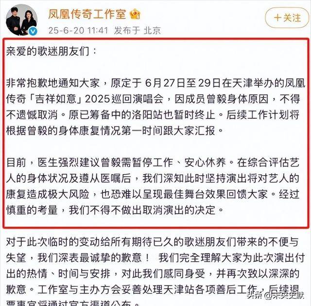 受此次事件影响,原本已经确定的天津和洛阳两场巡回演唱会被迫喊停,工作室发布公告称因曾毅身体原因取消演出,已经购票的观众可以办理退票。